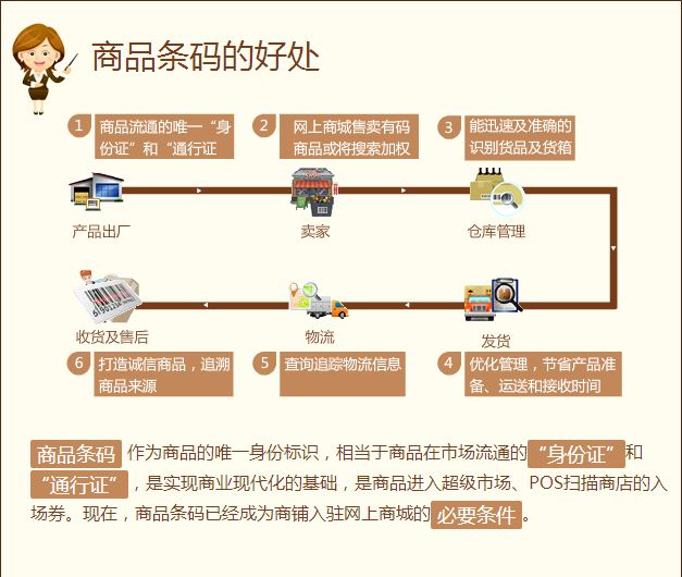是商品流通的唯一、身份证明和通行市场、打造诚信商品、追溯商品来源、优化商品管理、推广商品品牌。